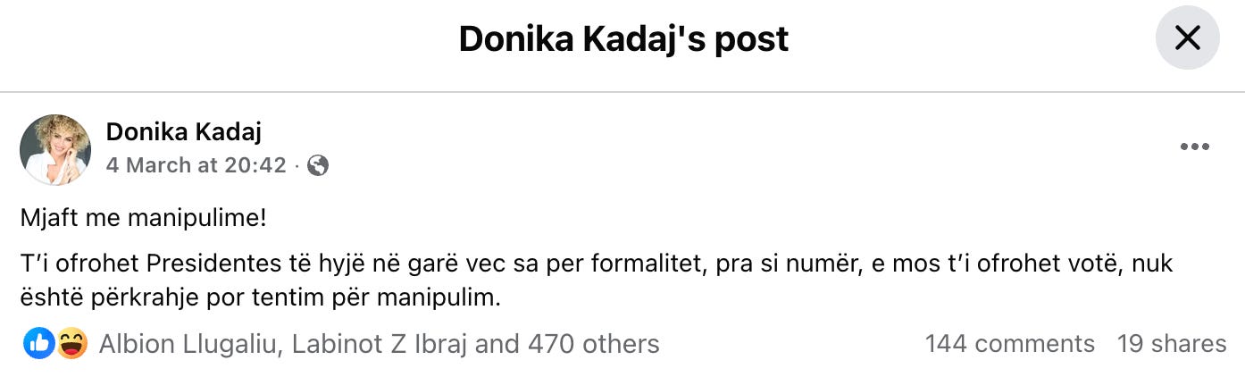 Në publik, mesazhi i saj ishte i drejtpërdrejtë. Faji për krizën, sipas saj, i takon deputetëve që nuk e kryen detyrën kushtetuese për ta zgjedhur presidentin.