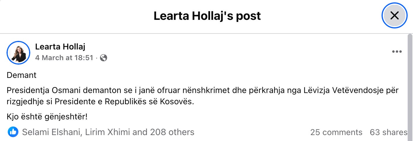 Më 4 mars 2026, shefja e grupit parlamentar të LVV-së, Arbërie Nagavci, deklaroi se partia e saj “e ka kandidatin e vet” dhe e identifikoi hapur Konjufcën si emrin që, sipas saj, gëzonte mbështetjen më të madhe në Kuvend5. Në të njëjtën kohë, Nagavci tha se LVV ia kishte ofruar nënshkrimet edhe Vjosa Osmanit për kandidaturën e saj të mundshme, por se presidentja nuk i kishte pranuar. Ky pretendim u hodh poshtë menjëherë nga Zyra e Presidentes. Shefja e kabinetit të saj, Learta Hollaj, e quajti publikisht6 këtë pretendim “gënjeshtër”, ndërsa më pas sqaroi se Osmanit nuk i ishte ofruar mbështetje reale për rizgjedhje, por vetëm një rol formal si kundërkandidate përballë Konjufcës, sa për ta plotësuar kushtin procedural të garës7. Të njëjtën vijë e mbajti edhe këshilltarja Donika Kadaj, e cila tha se një ofertë “veç sa për formalitet” nuk përbën mbështetje politike8, por tentim manipulimi.