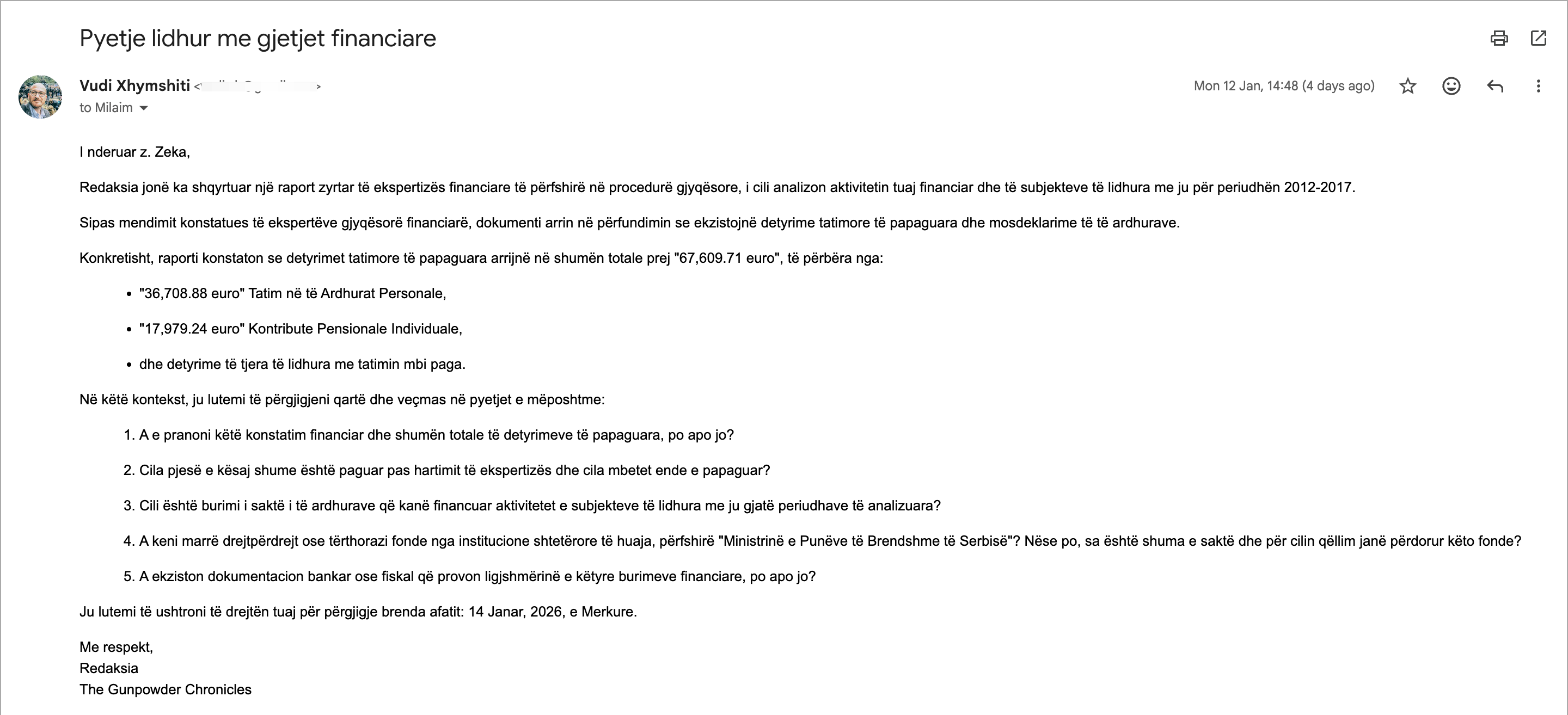 Gunpowder Chronicles i ka dhënë Milaim Zekës çdo mundësi për të folur. Dokumentet janë aty. Pyetjet janë dërguar. Heshtja e tij nuk është mungesë informacioni. Është zgjedhje. Dhe në gazetarinë investigative, ashtu siç e mëson tradita më e mirë narrative, heshtja përballë provës është pjesë e tregimit.