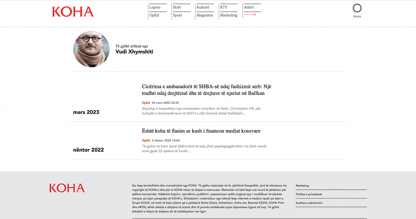 Marrëdhënia ime me mediat e Kosovës ka qenë e tensionuar, për të thënë të paktën. Në fillim, bashkëpunova me gazetën Koha Ditore7, duke dërguar opinione për financimin e mediave8 dhe kritikën time ndaj ambasadorit amerikan në Beograd për kërkim falje Serbisë për fushatën e bombardimeve të NATO-s9. Pas botimit të dy artikujve, shkrimet e mia u ndalën papritur. Një model i ngjashëm u shfaq me Kallxo.com, një medium i udhëhequr nga Jeta Xharra, e cila më akuzoi se artikujt e mi ishin shkruar nga individë të lidhur me partinë në pushtet në Kosovë. Pavarësisht përpjekjeve të mia për t’u angazhuar profesionalisht me të, ajo zgjodhi të shmangë dialogun kuptimplotë. Znj. Xharra nuk pajtohej me kritikën time profesionale10 drejtuar misionit të BE-së në Kosovë. Kjo mungesë llogaridhënieje është zhgënjyese dhe tregon për sfidat që përballen gazetarët si unë në ruajtjen e integritetit në një mjedis të polarizuar si Kosova.