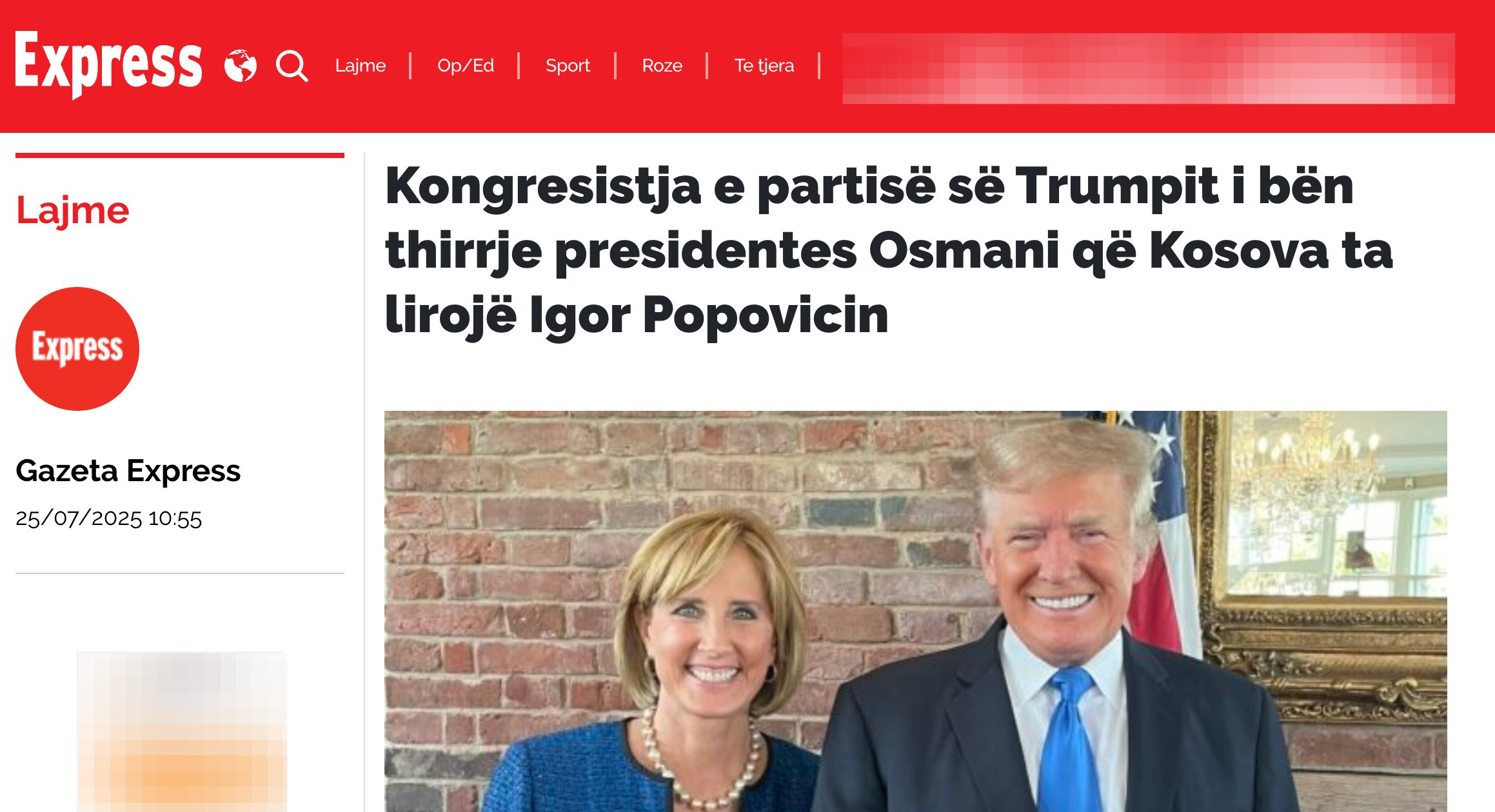 Kongresistja e partisë së Trumpit i bën thirrje presidentes Osmani që Kosova ta lirojë Igor Popovicin — Gazeta Express.