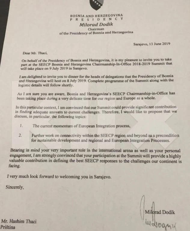 Në një ftesë të zbuluar nga media boshnjake Klix.ba, Dodik shprehej entuziast për praninë e Thaçit: