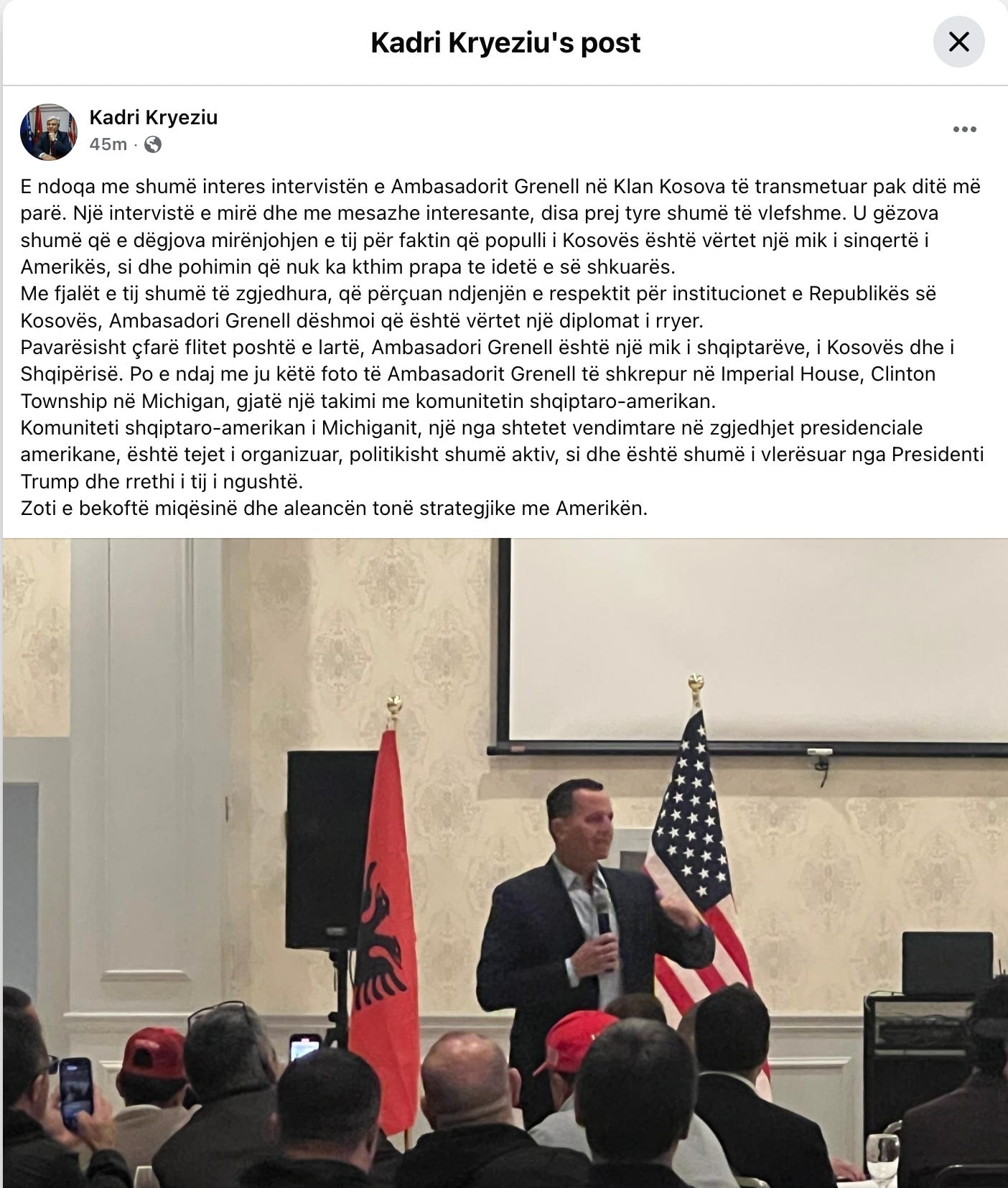 Të mërkurën në mëngjes, një lexues i rregullt dhe shpesh sfidues, Zijadin Sahiti, më “thirri” në një postim të Kadri Kryeziut, ish-anëtar i Gjykatës Kushtetuese dhe komentator i shpeshtë në televizione. Z. Kryeziu kishte publikuar në Facebook1 një status lavdërues për Richard Grenellin, të cilin e përshkruante “mik të shqiptarëve… diplomat i rryer”, i emocionuar që “nuk ka kthim prapa te idetë e së shkuarës” dhe i bekuar nga “miqësia dhe aleanca jonë strategjike me Amerikën.” Ai postoi edhe një foto nga një takim i Grenellit me komunitetin shqiptaro-amerikan në Michigan.