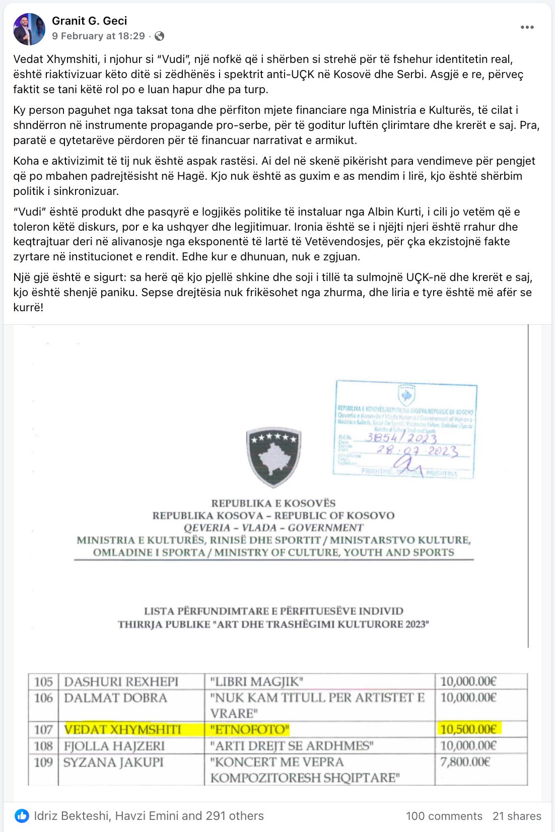 Postimi në Facebook i Gani Kocit, 22 Shkurt, 2026.