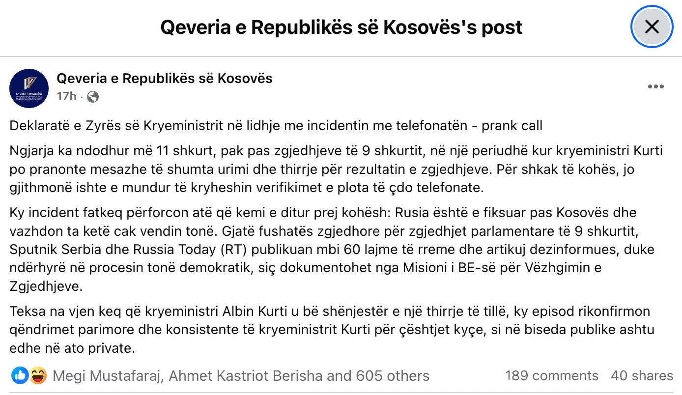 Më 26 mars 2025, publikova një analizë kritike për një incident diplomatik serioz që përfshiu Kryeministrin në detyrë të Kosovës, i cili ra pre e një telefonate të rreme të orkestruar nga dy komedianë rusë të njohur. Ata u shtirën si Presidenti i Letonisë dhe gjatë bisedës, e cila zgjati rreth dhjetë minuta, u dhanë deklarata që dolën në publik dhe shkaktuan reagime të gjera.