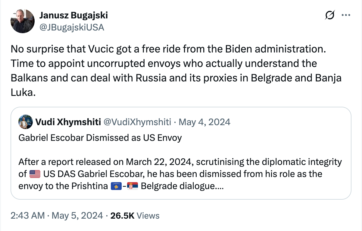 “Jo për t’u çuditur që Vuçiçi merr udhë pa pengesa nga administrata Biden. Është koha për të dërguar emisarë të pakorruptuar që e kuptojnë Ballkanin.”