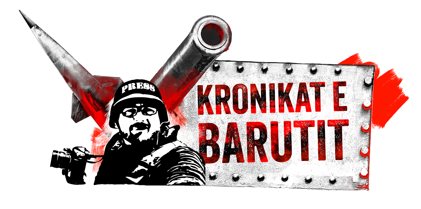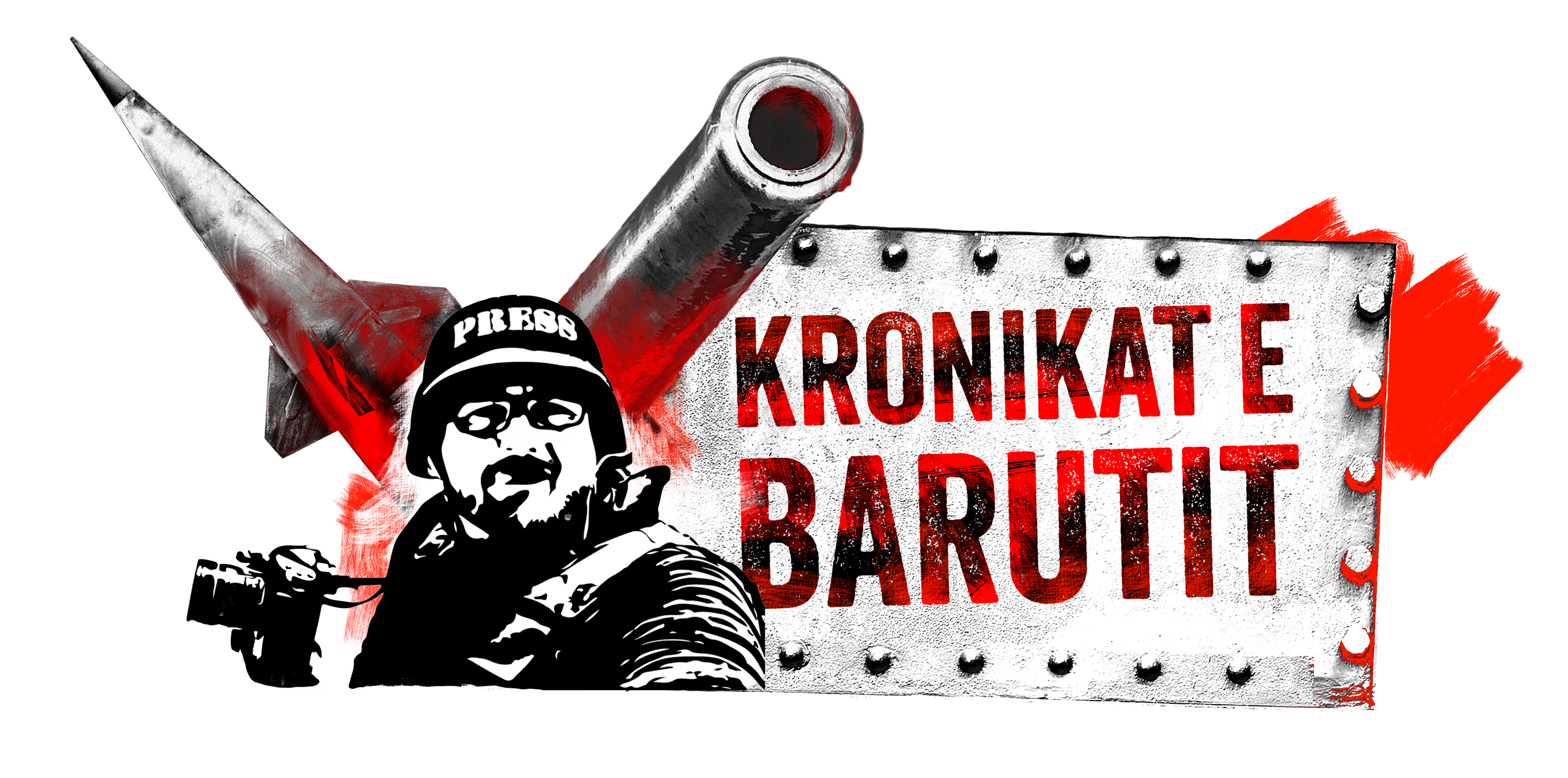 Pllaka metalike me vida, mbi të cilën qëndron emri “KRONIKAT E BARUTIT”, thërret qëndrueshmëri, forcë dhe rezistencë. Teksti i kuq i theksuar mbi sfondin metalik simbolizon urgjencën dhe gravitetin e çështjeve që i trajtojmë.