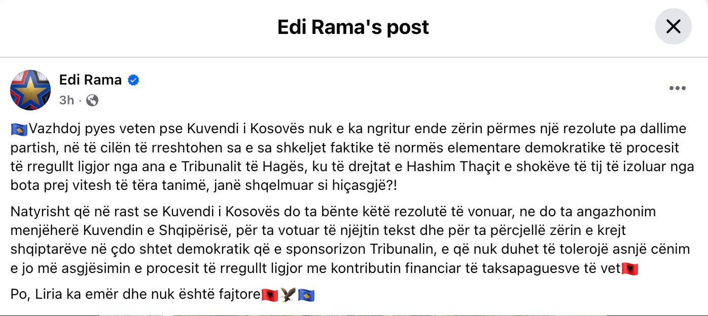 Ti nuk po e sfidon gjykatën sepse është e padrejtë, po e sfidon sepse po prek rrjetin tënd politik, sepse po e zbërthen mitin e rremë që ti dhe Thaçi e keni shitur: se liria dhe ligji janë të papajtueshme. Në fakt, është e kundërta, dhe ti je provë e gjallë e kësaj. Një kryeministër që hesht për viktimat e kombit të vet, por flet me pasion vetëm për aleatin e tij të kapur, nuk është lider, por ortak në krim. Dhe ortakët në krim, kur koha e drejtësisë vjen, nuk i shpëton as retorika, as flamuri, as arroganca. Historia të pret, zt Rama, dhe këtë herë nuk do jesh ti ai që shkruan versionin e saj.