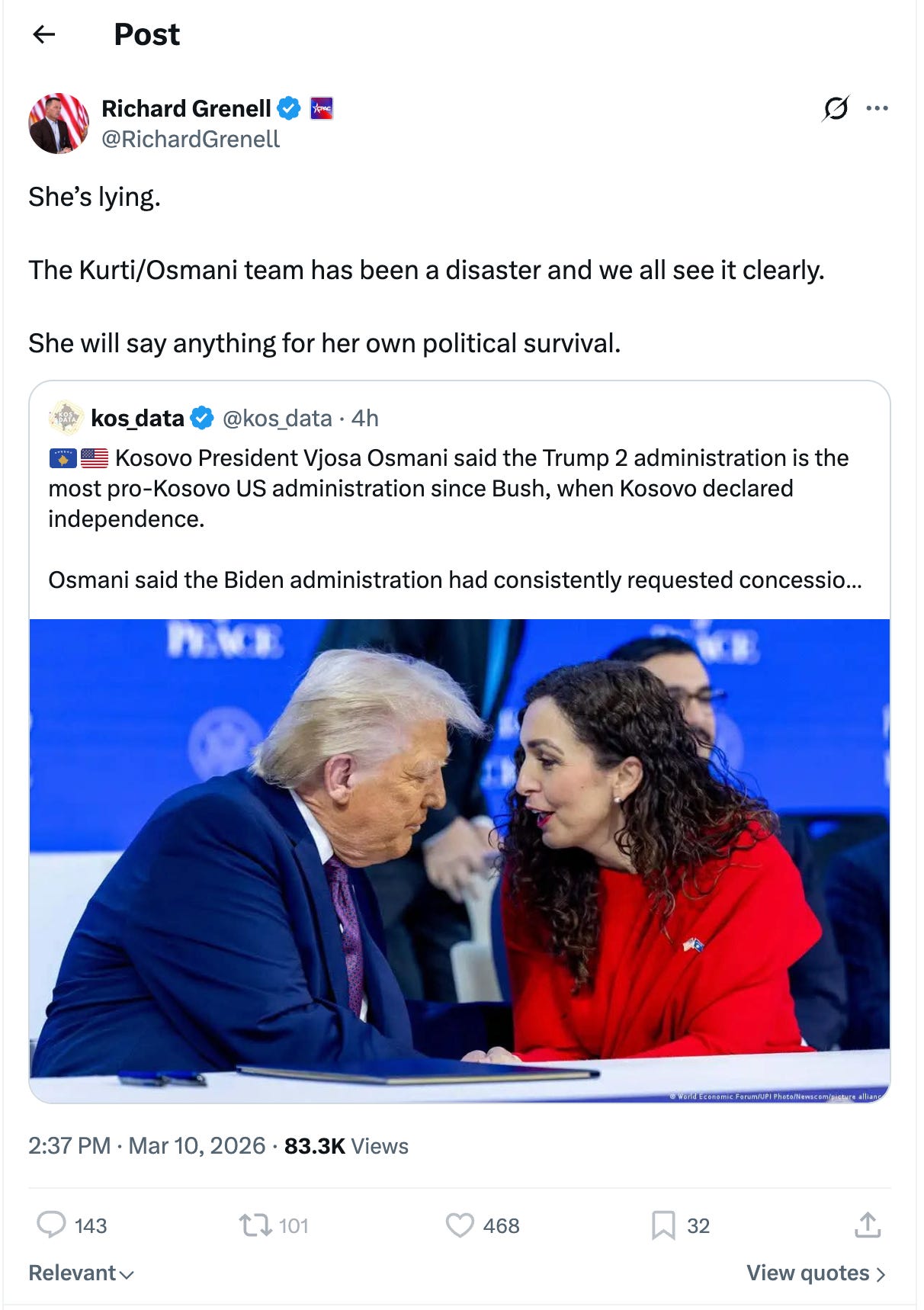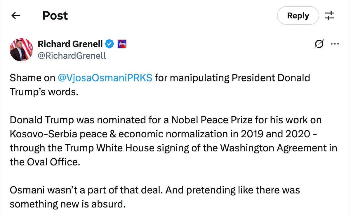 Osmani echoed Trump’s own claim of averting war and suddenly, Grenell and Vucic panicked. Not because she lied, but because she quoted him. — The GPC Politics.