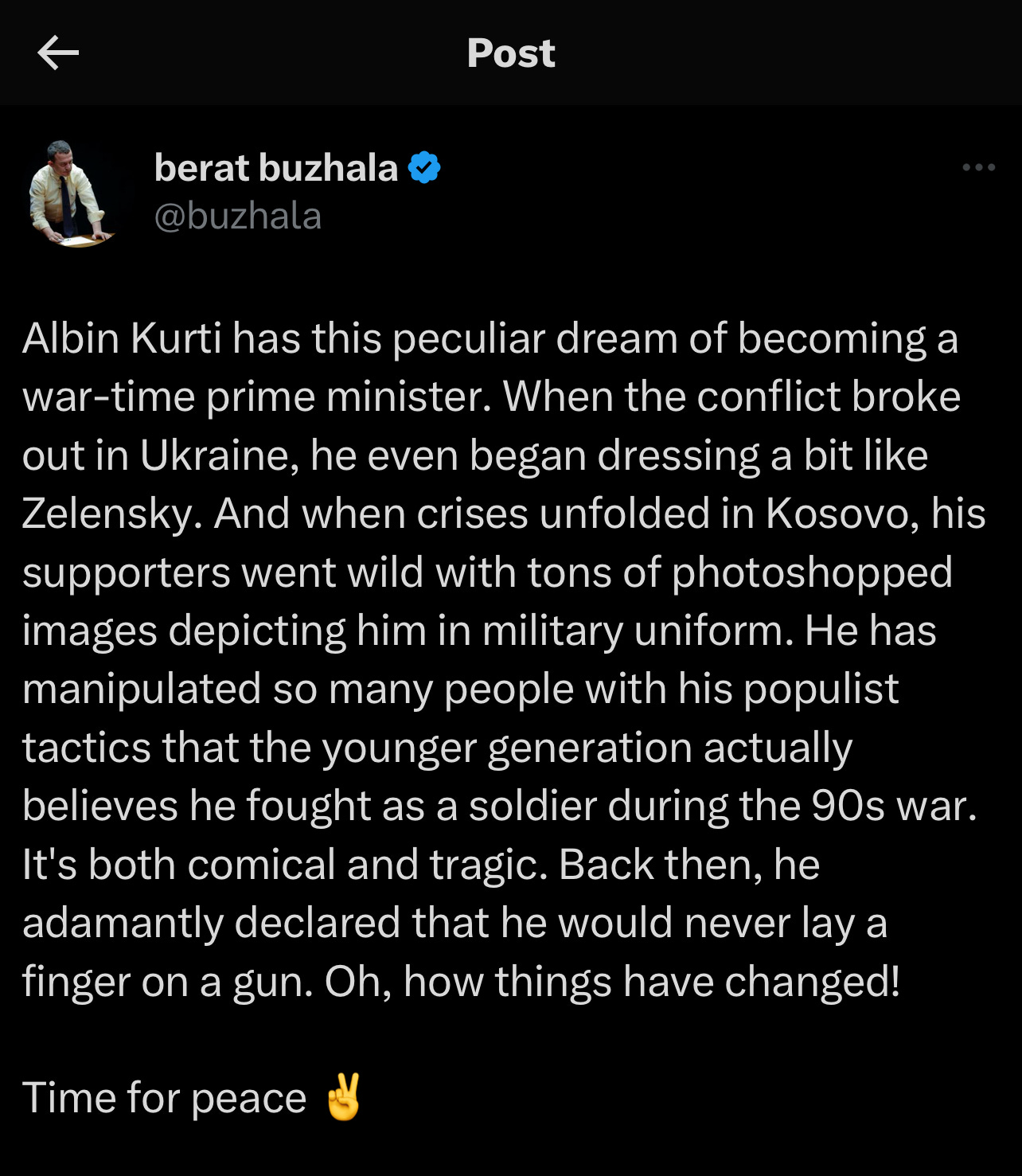 Kosova meriton më shumë se të jetë e nënshtruar ndaj kapriçove të një pakice të korruptuar që kërkon të ringjallë të kaluarën për përfitimet e saj plaçkitëse. Komuniteti ndërkombëtar duhet të njohë këtë manovrim të rrezikshëm për atë që është dhe të qëndrojë fort kundër këtyre përpjekjeve të pandershme për të rishkruar historinë dhe për të destabilizuar rajonin. Populli i Kosovës ka luftuar shumë dhe është përballur me shumë sfida që t’i lejohet t’i ndodh një maskarallëk i tillë, prandaj secili nga ne e kemi obligim që të mos e lejojmë që e ardhmja e tij të përcaktohet nga një rrjet kriminal që maskohet si një shtyp i lirë.