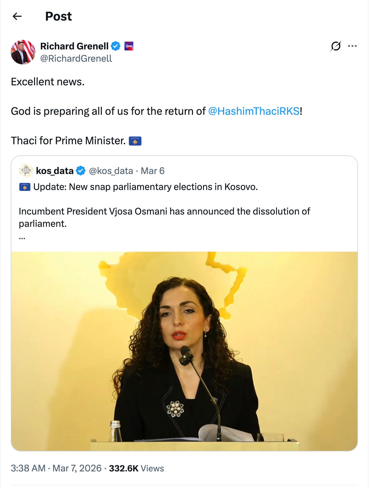 Kjo pyetje bëhet edhe më e mprehtë kur vërehet një model më i gjerë optikash dhe përfituesish politikë. Ne kemi raportuar me kujdes se disa zhvillime të muajve të fundit, nga Davosi te “Bordi i Paqes”, nga ndërhyrjet publike të Edi Ramës te reagimi festiv5 i Richard Grenell pas shpërndarjes së Kuvendit, nuk provojnë vetvetiu ekzistencën e një pakti, të një bashkëpunimi të fshehtë apo të një operacioni politik të koordinuar. Ta thuash të kundërtën si fakt i kryer do të ishte e padrejtë dhe e pambështetur. Por është po aq e drejtë të vërehet se këto epizode, të vendosura pranë njëri-tjetrit, formojnë një model shqetësues përfituesish politikë dhe kanalesh të paqarta, i cili meriton jo heshtje, por shqyrtim të rreptë.