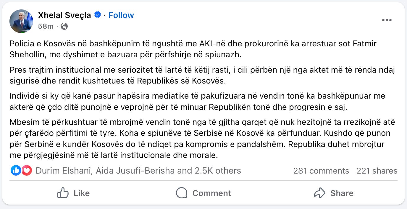 “Fatmir Sheholli ka punu për AKI-në, kanë dalë dokumenta… ka marrë gjashtëqind e katërdhjetë mijë euro prej AKI-së… Tash ka na dul ky për spiunazh, po ato… janë punë të shtetit.”