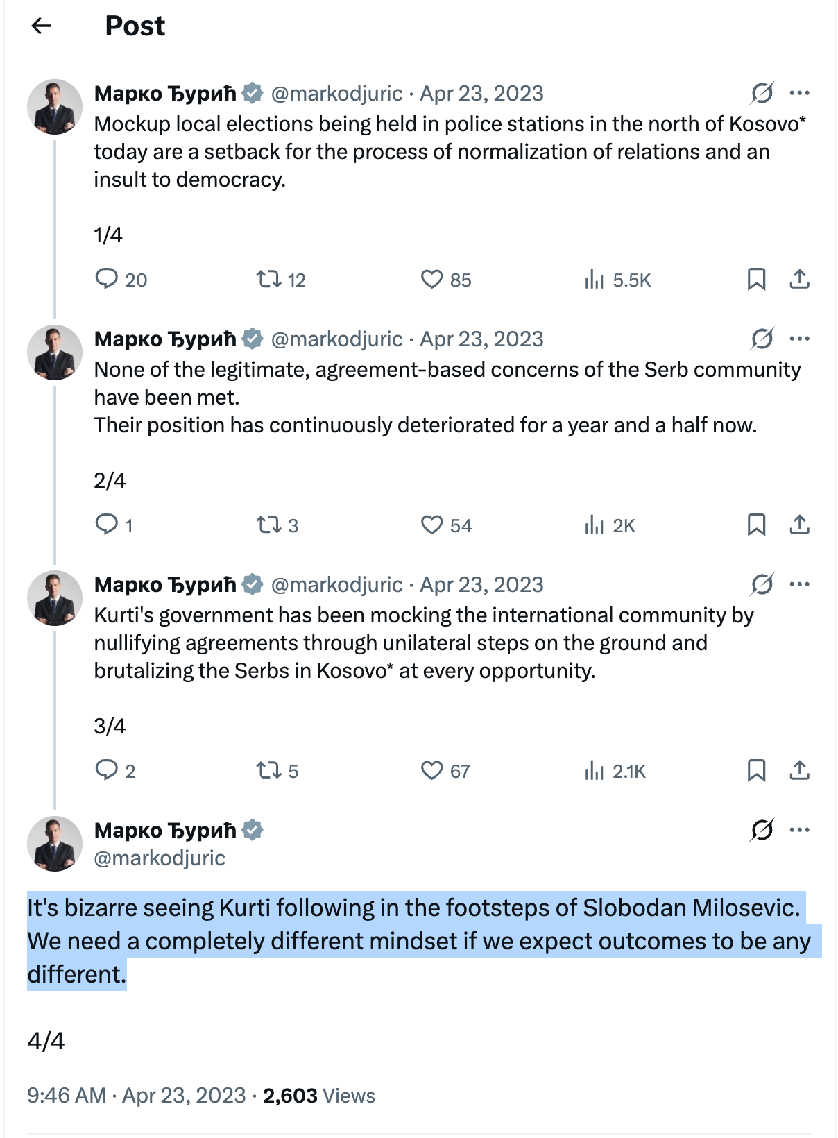 Postimi i Marko Gjuriqit në rrjetin social X, 23 Prill, 2023.