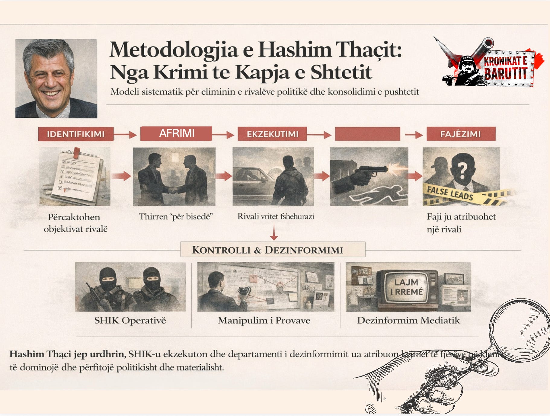 Hashim Thaçi jep urdhrin, SHIK-u ekzekuton, dhe departamenti i dezinformimit ua atribuon krimet të tjerëve në mënyrë që klani të dominojë dhe të përfitojë politikisht dhe materialisht.