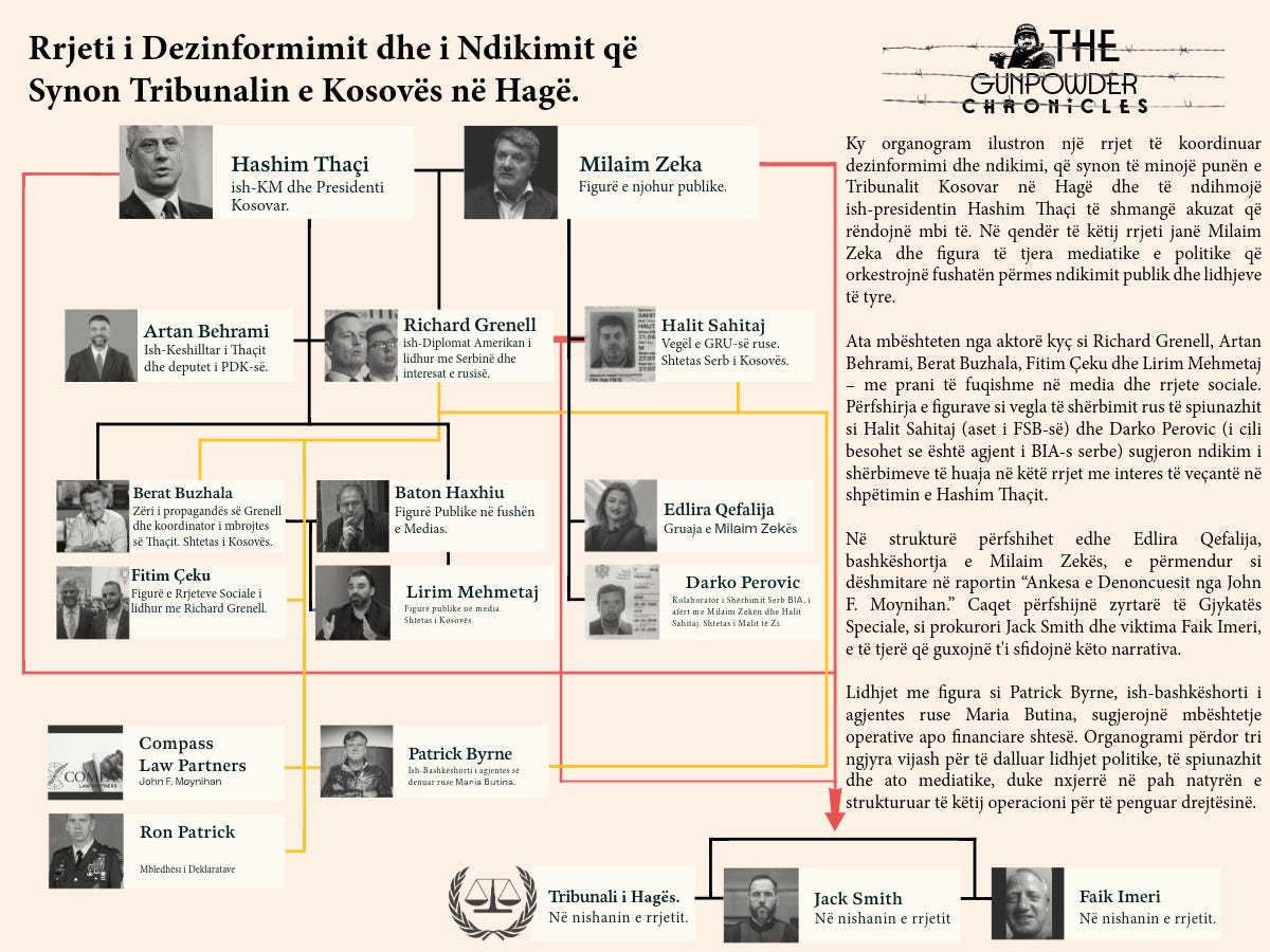 Këtu linja jonë e gjetjeve hulumtuese21 në prill 2025 lidhet sërish me metodologjinë e vrasjeve të pas luftës. Nëse ekziston një rrjet, siç e ka gjetur raportimi ynë22 dhe ka zbuluar përfshirjen e figurave si Richard Grenell, Edi Rama, Halit Sahitaj, Milaim Zeka, Berat Buzhala, Artan Behrami dhe të tjerë, që synon të minojë procesin gjyqësor të Kosovës në Hagë, kjo nuk do të ishte një ide e re. Do të ishte një vazhdim i një praktike më të vjetër, përdorimi i operacioneve të informacionit për të formësuar rezultatet e drejtësisë. Aktorët ndryshojnë uniformat. Logjika mbetet e njohur.