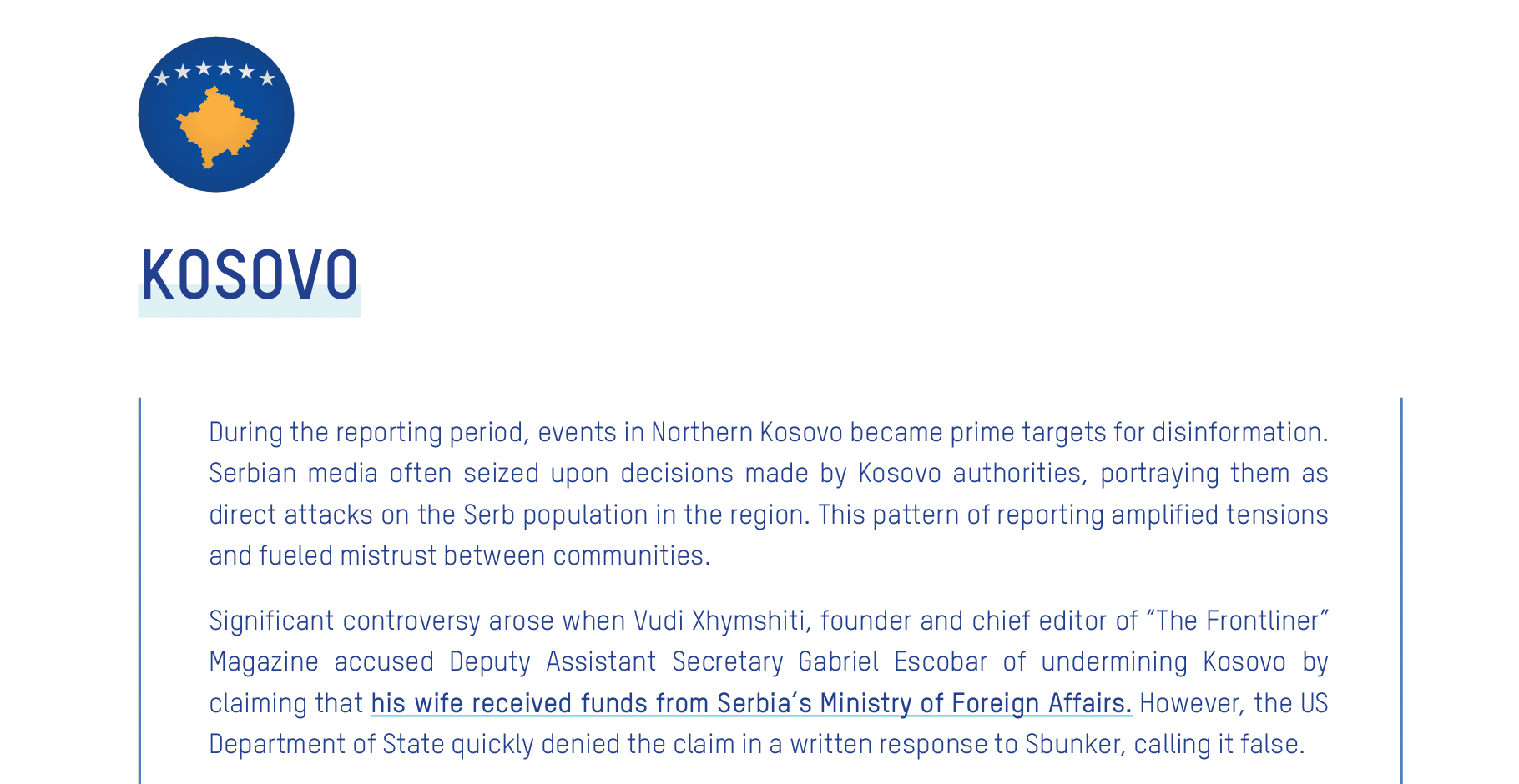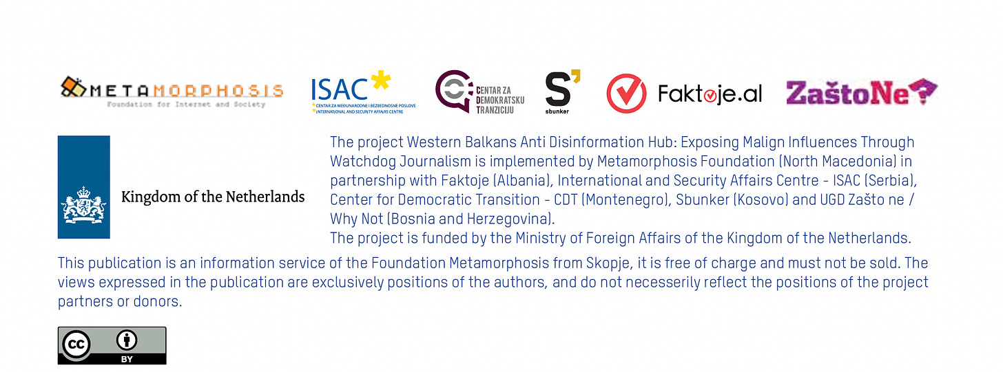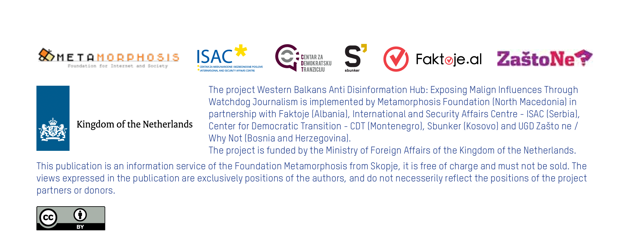 I financuar nga Ministria e Punëve të Jashtme e Mbretërisë së Holandës dhe i zbatuar nga organizata si Metamorphosis Foundation, Faktoje (Shqipëri), ISAC (Serbi), CDT (Mali i Zi), Sbunker (Kosovë) dhe UGD Zašto ne (Bosnjë-Hercegovinë), ky raport shtrembëron rëndë punën time hulumtuese2 duke e quajtur “akuza të pabaza” dhe duke e etiketuar gazetarinë kritike si dezinformim.