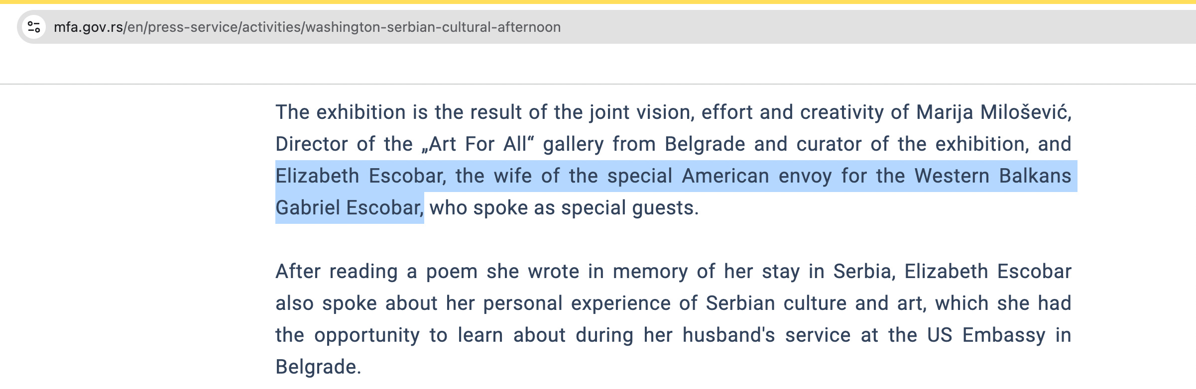 Zbulimi i Lidhjes Zyrtare: Një deklaratë publike për shtyp nga MPJ e Serbisë nxjerr në pah bashkëpunimin mes Elizabeth Eskobar, bashkëshortja e të dërguarit amerikan Gabriel Escobar, dhe Marija Millosheviç në një ngjarje kulturore. Ky zbulim ngre shqetësime serioze mbi paanshmërinë diplomatike dhe bazat etike të angazhimit amerikan në Ballkan.