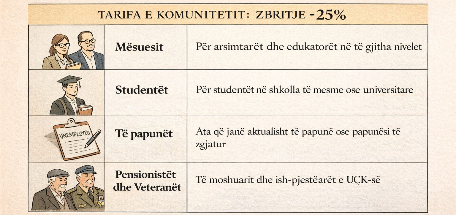 Shumë prej jush veçanërisht mësues, pensionistë, veteranë të luftës së lavdishme çlirimtare dhe studentë na keni kontaktuar për të pyetur nëse ekziston mundësia e një tarife të reduktuar.