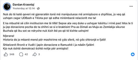 Nuk ka asgjë më tragjike, e njëkohësisht më banale, sesa një njeri që, kur i zhveshur nga argumenti e i zënë në faj, turret të fshihet pas rrobave të vjetra të luftës. Për Dardan Krasniqin dhe kastën e tij, thirrja e dëshpëruar në emër të UÇK-së sa herë që ballafaqohen me të vërtetën, është çertifikata e tyre e falimentimit moral. Ky lloj “patriotizmi” me bateri të shprazura nuk është nderim për historinë, por një përdhunim i saj, është dëshmia se pas vitit 1999, kronika e tyre ka mbetur një shkretëtirë pa asnjë akt lavdie. Publiku i Kosovës nuk ka asnjë detyrim t’ua pranojë uniformën e djeshme si imunitet për paudhësitë e sotme. Nëse e vetmja gjë që keni për të ofruar është jehona e një pushke që ka heshtur para një çerekshekulli, atëherë ju nuk jeni gjë tjetër veçse fantazma5 që kërkojnë haraç mbi një liri që nuk ju përket vetëm juve. Epoka e miteve që shërbejnë si mburojë për kërcënime rrugësh ka vdekur. Sot, ju nuk mateni me atë që e thoni se keni qenë në male, por me atë që jeni katandisur në sheshe, tregtarë të vegjël të mllefit që, në mungesë të dinjitetit, provokojnë dhunë për ta fshehur boshllëkun e tyre absolut.
